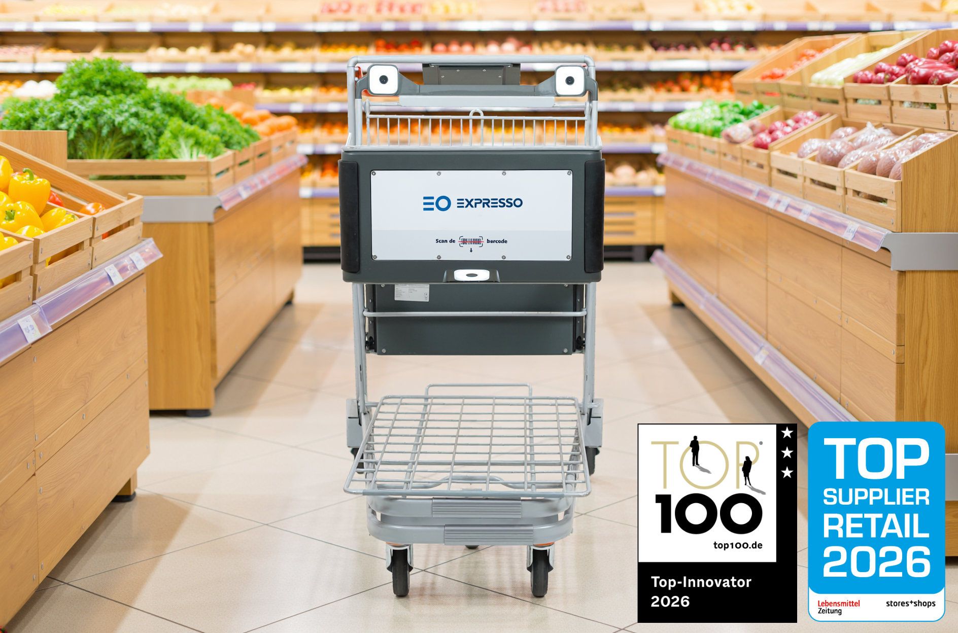 Der EXPRESSO SmartShopper® EO Complete revolutioniert den Einkauf. Mit integrierter Scan- und Wägeeinheit ermöglicht er das Scannen und Wiegen von Artikeln direkt im Wagen.